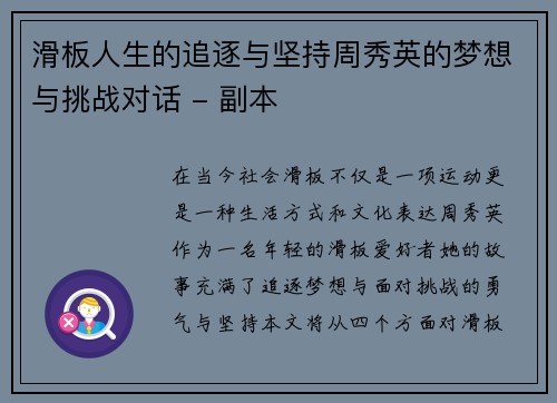 在当今社会,滑板不仅是一项运动,更是一种生活方式和文化表达。周秀英作为一名年轻的滑板爱好者,她的故事充满了追逐梦想与面对挑战的勇气与坚持。本文将从四个方面对"滑板人生的追逐与坚持 周秀英的梦想与挑战对话"进行详细阐述:首先,探讨周秀英如何走上滑板之路,其次分析她在追梦过程中的心路历程,再次讨论她面对挑战时的应对策略,最后总结她所传递出的积极向上的精神力量。通过这些方面,我们可以更深入地了解到滑板运动背后的情感及其所蕴含的人生哲理。